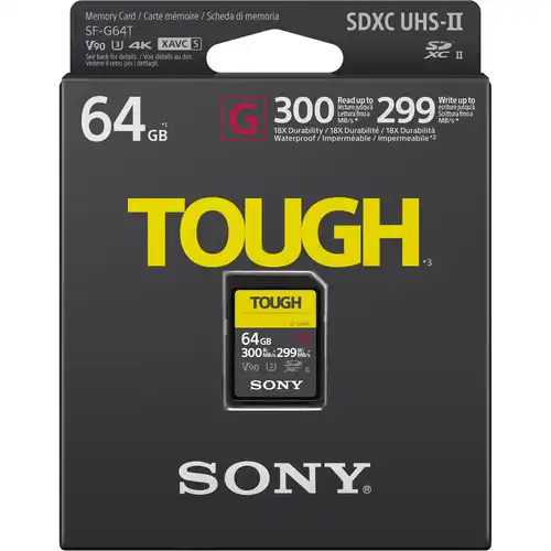 La carte mémoire SDXC SDXC de la série 64GB SF-G TOUGH de Sony dispose d’une capacité de stockage de 64GB et tire parti du bus UHS-II pour prendre en charge les fonctions DSLR avancées telles que les rafales d’obturation continues et le tir rapide, ainsi que les captures RAW et JPEG. Cette carte est également bien adaptée à la capture vidéo, y compris la vidéo 8K, 4K XAVC S, 60p AVCHD, 3D, HFR et Full HD, et peut atteindre des vitesses de lecture maximales allant jusqu’à 300 MB/s et des vitesses d’écriture maximales allant jusqu’à 299 MB/s. Grâce à sa classe de vitesse V90, les vitesses minimales d’écriture sont garanties de ne pas descendre en dessous de 90 MB/s.