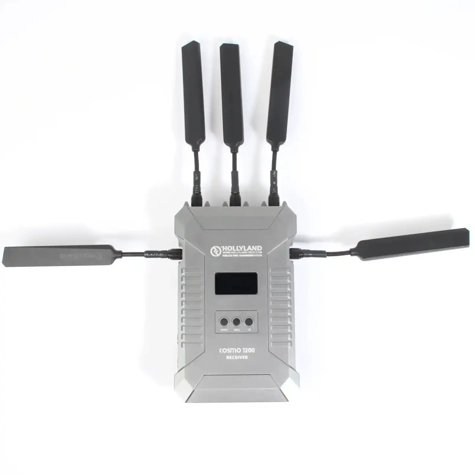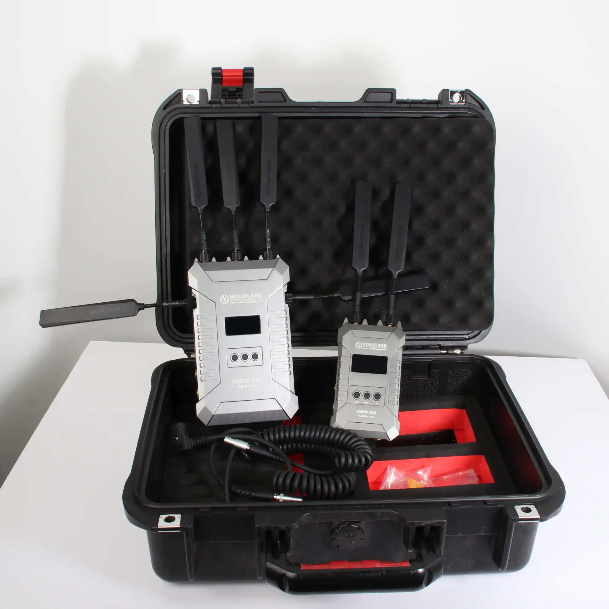 Deux câbles D-Tap vers LEMO sont inclus pour fournir la flexibilité d’alimenter les deux unités via une connexion par câble à des batteries compatibles disponibles séparément. L’émetteur utilise deux antennes et le récepteur, cinq antennes. Tous les sept sont incluses